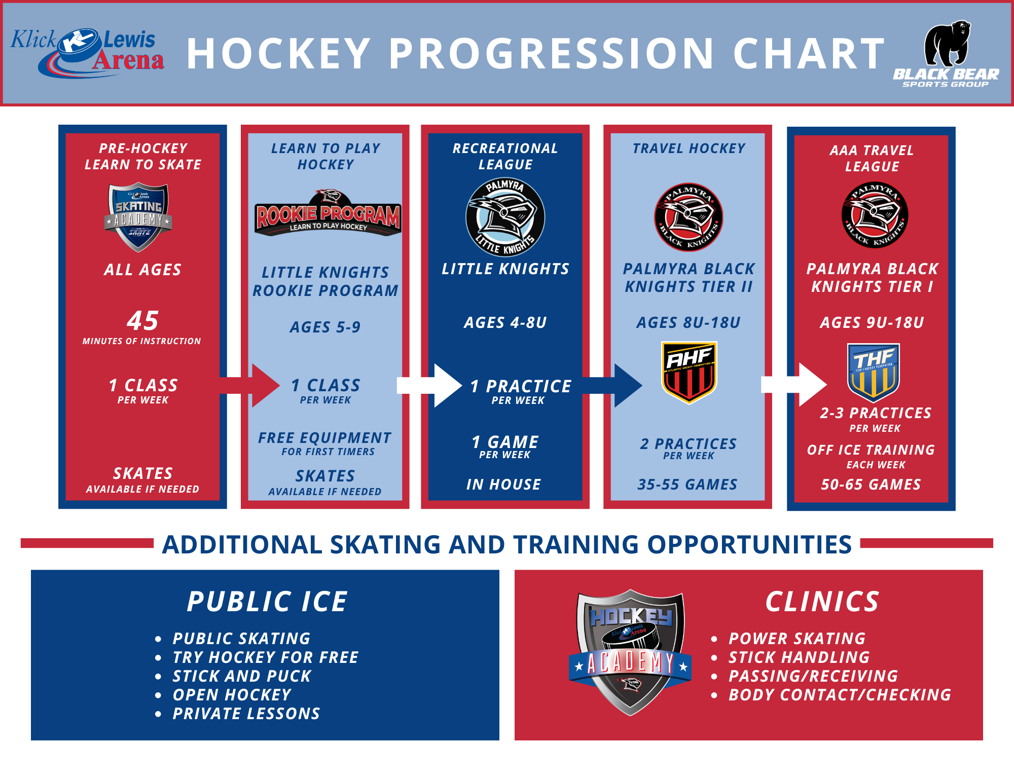 Klick Lewis Arena youth learn to play hockey program is designed around the guidelines of USA Hockey’s ADM model, which creates a fun, relaxed learning environment for participants to learn the fundamental skills of ice hockey. The non-competitive and positive atmosphere not only makes a child’s first experience with hockey positive, but also creates an environment that they can excel. Participants will not only learn the skills and game of ice hockey, but will also develop self-esteem and self-confidence.The program operates under the premise that if a player’s introduction to the sport is positive, they will develop a lifetime love of the game. Our hockey programs are taught by the Arena's hockey staff, who are comprised of USA Hockey certified coaches with an extensive playing background.